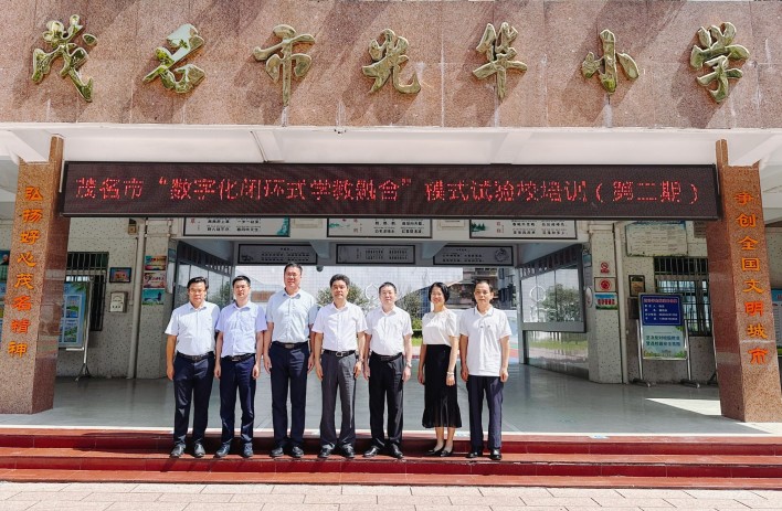 27日上午,胡钦太一行与茂名市委教育工委书记、市教育局党组书记、教育局局长林卫兴,试点学校校长等共同为茂名市“数字化闭环式学教融合”模式试点培训班揭牌,茂名市光华小学和福华小学全体试点教师共同出席见证揭牌仪式。