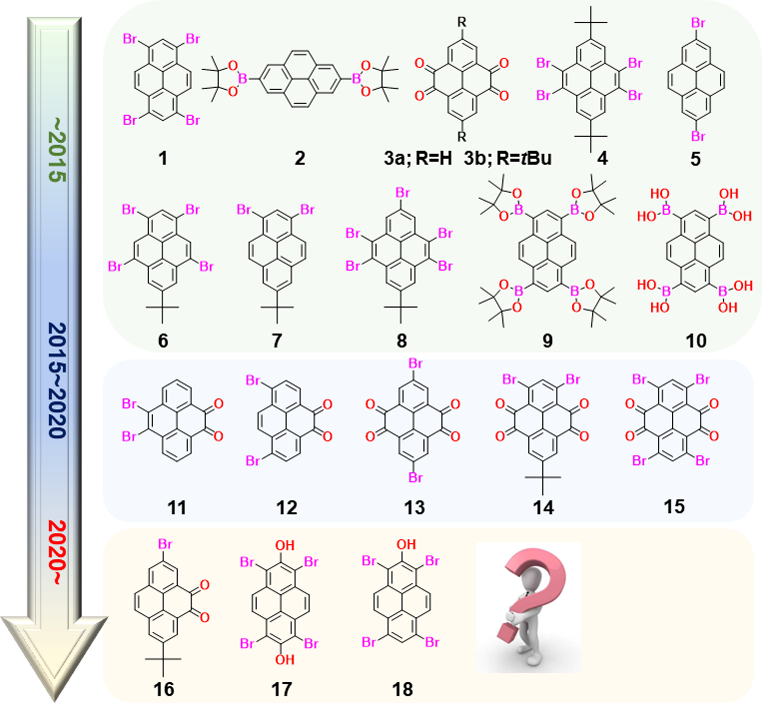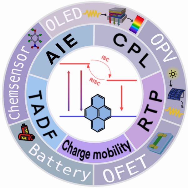 伴随着聚集体科学概念的提出和日渐成熟,芘基发光材料的聚集态行为得到了深入的研究和理解,研究人员不仅开发了大量新型芘基发光材料,研究了其分子结构与性能之间的关系,还致力于阐明聚集形态对其光电性能的影响。回顾过往不难发现,大多数芘基材料的研究多集中在新型芘基发光分子及其相关应用、芘基分子的构效关系等方面,却忽略了芘及其衍生物从单分子到聚集体形成的过程中伴随出现的新奇的光物理现象、以及随之而来出现的潜在新应用。如今,芘基聚集体科学已经初具雏形,芘基聚集体材料表现出力致发光/力致变色、磷光发射、圆偏振发光、热激活延迟荧光、载流子传输、能量存储、自组装、特异性识别等不同于单分子的独特性质,并在有机发光二极管、场效应晶体管、有机太阳能电池、锂电池、生物成像、环境检测、荧光防伪等领域展露锋芒。