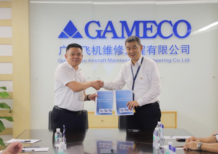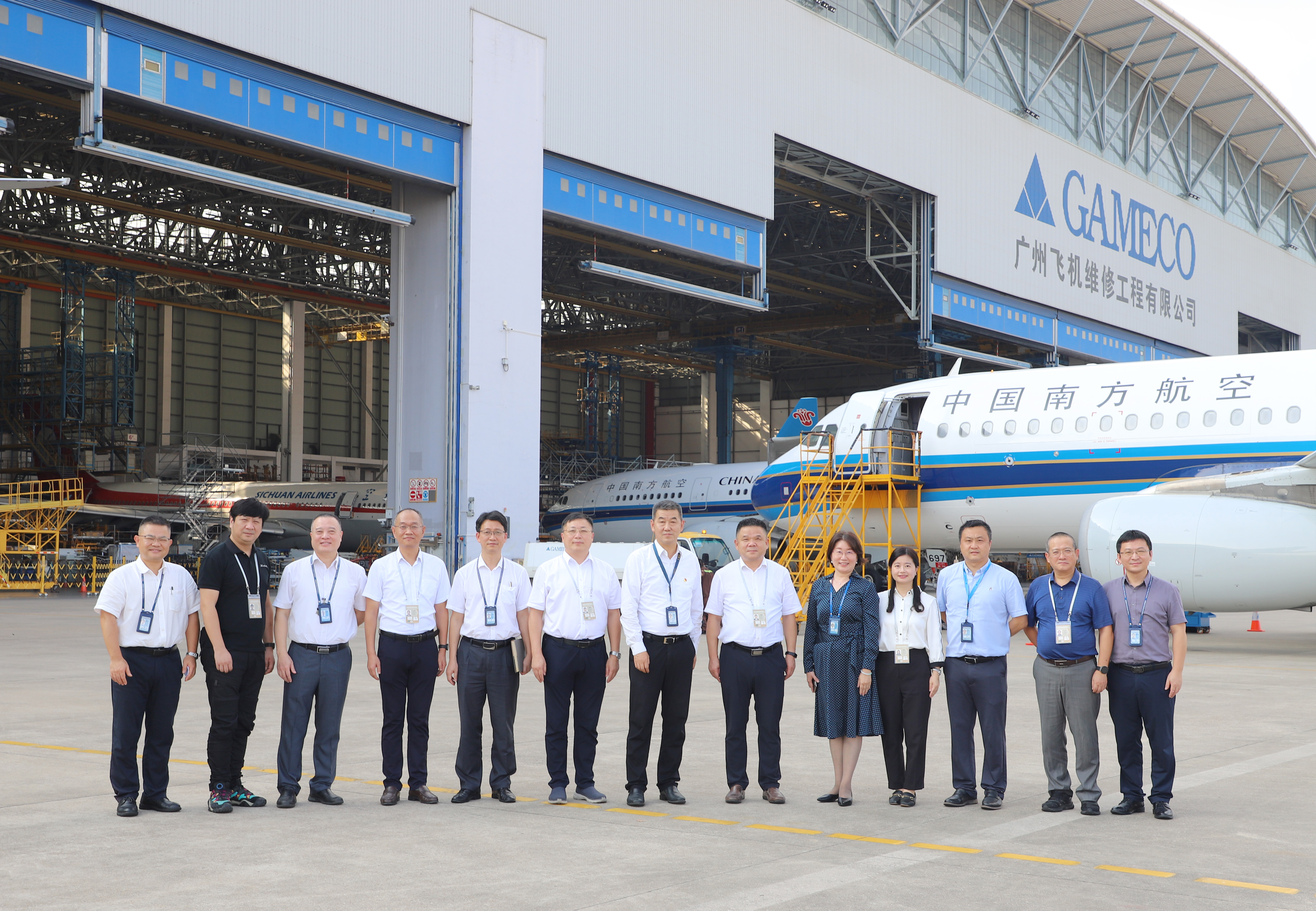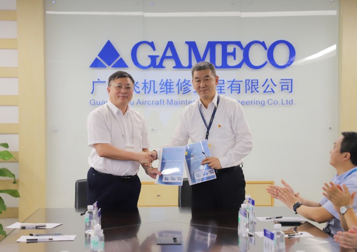 在与会人员的见证下,甘拥军与杜承铭签署了研究生联合培养协议,与王成勇签署了战略合作备忘录。会后,双方人员共同参观了广州飞机维修工程有限公司机库并合影留念。