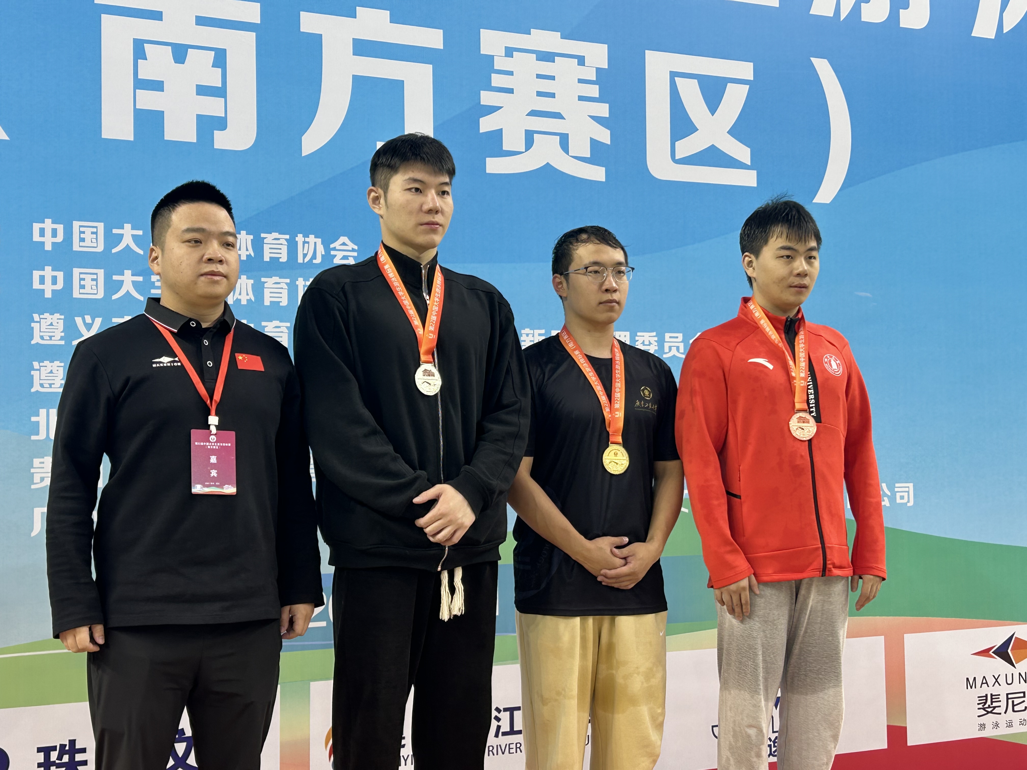 甲组比赛中,学校共斩获2枚金牌、5枚银牌和1枚铜牌,男子团体总分位列第二。其中,2023级研究生李直和靳修远分别在男子个人200米混合泳和男子个人200米蝶泳项目中获得金牌。