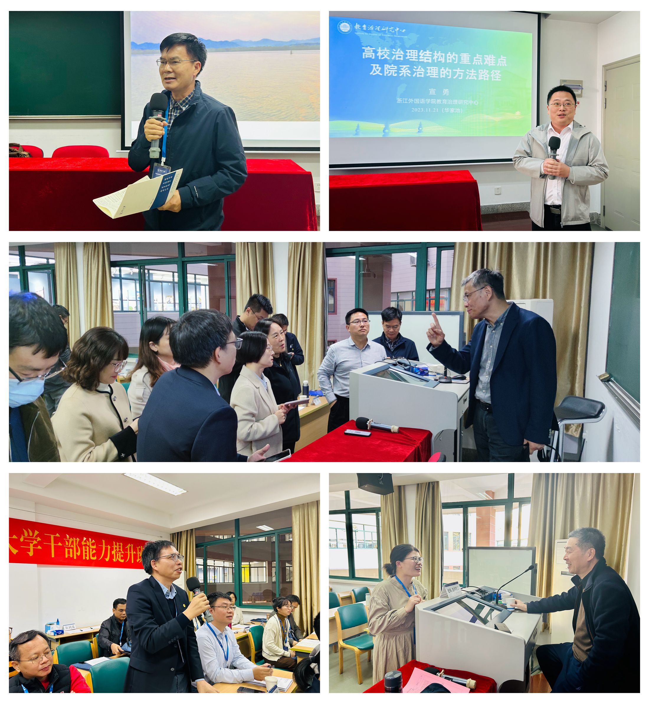 专题讲座中,叶高翔教授以《“双一流”建设背景下高等教育的改革与创新》为题,讲述了“双一流”建设背景下高校的战略抉择,及其对新时代高等教育改革的探索与思考。浙江工业大学原校长李小年教授聚焦《深学笃行,建设教育强国——深入学习习近平总书记关于教育工作的重要论述》的主题,从深刻理解和把握习近平总书记关于教育工作重要论述的时代背景和重要意义、核心思想和精髓要义、理论体系和内在逻辑、思想方法和实践路径四个方面,深入探讨了“培养什么人、怎样培养人、为谁培养人”这一教育的根本问题。浙江省委党校原副校长郑仓元教授讲授《提升七种能力,强化责任担当》,与大家深刻探讨了面对新形势、新目标、新挑战,干部自身淬炼成钢的目标和路径。浙江外国语学院党委书记宣勇教授从党建统领力、战略谋划力、组织变革力三个方面与大家交流了对“高校治理结构的重点难点及院系治理的方法路径”的思考。浙江大学经济学院法与经济研究所副所长周黎明副教授用风趣生动、通俗易懂的话语讲授《依法治校和学校干部法律风险防范》,将晦涩的法律条款变成了一个个生动鲜活的案例,提升了参训干部的“法商”。浙江省教育厅原副巡视员、新闻发言人夏建勇老师的《领导干部思维方法和工作艺术》,在领导干部要做到思想观念与时俱进、牢固树立稳定意识、苦干巧干善作善成、统筹兼顾凝心聚力四个方面分享了大量的思考和案例。浙江省舆情研究中心副主任冯婷教授,讲授《全媒体时代高校的舆情防范与危机应对》,通过对舆情热点事件和领导干部不适应现象的分析,提出了领导干部在危机应对、与媒体打交道时候的原则和技巧。