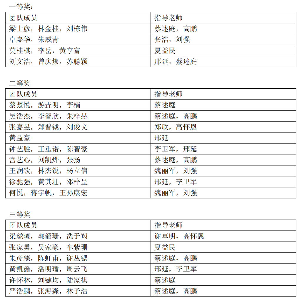 参赛队伍获奖名单
