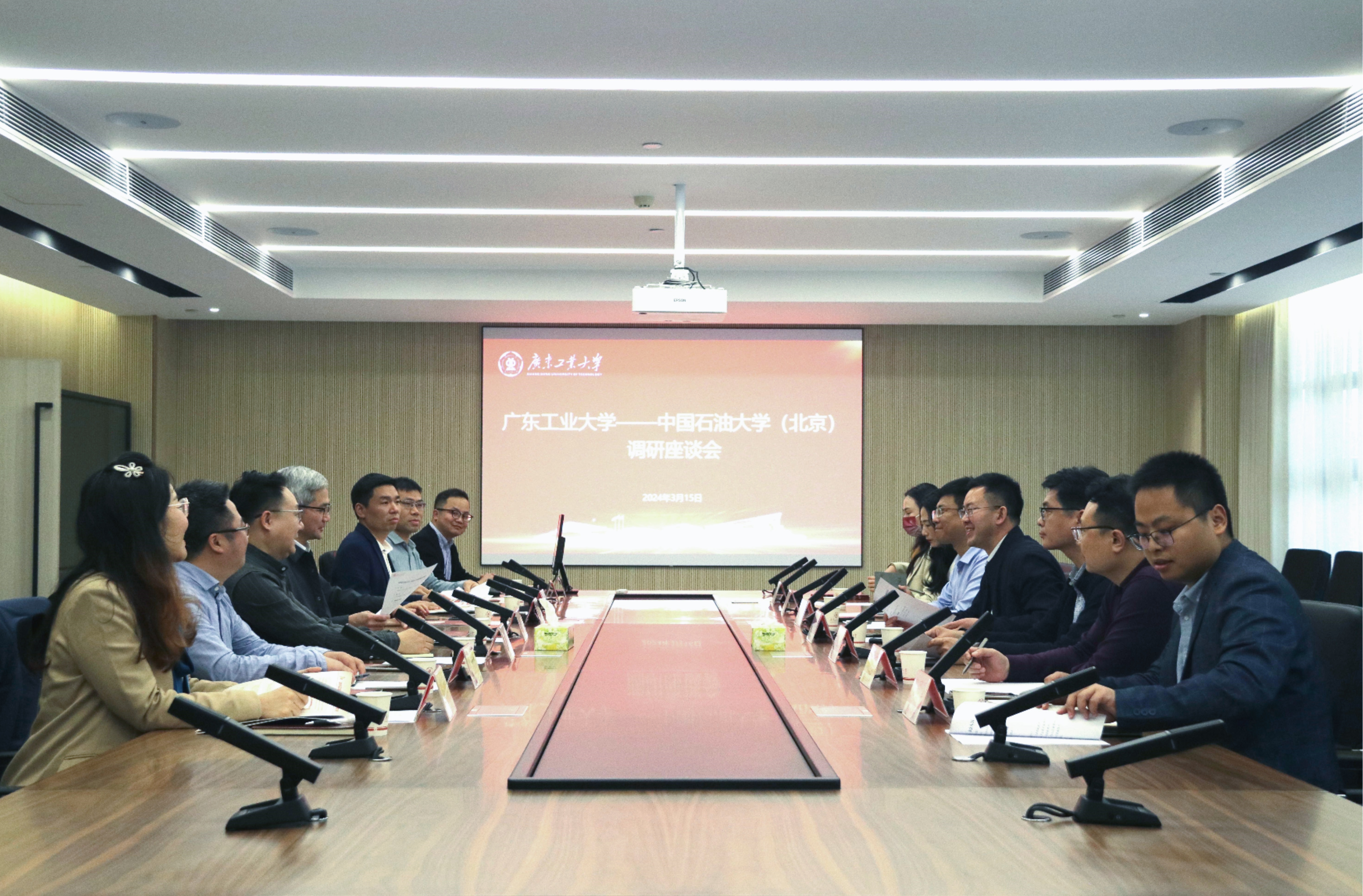 3月15日,中国石油大学(北京)党委副书记文永红一行来校调研交流,广工党委副书记陈卓武在行政楼602会议室会见来宾。学校党委学生工作部、创新创业学院、产业技术研究与开发院和机电工程学院、计算机学院相关负责同志参加座谈。
