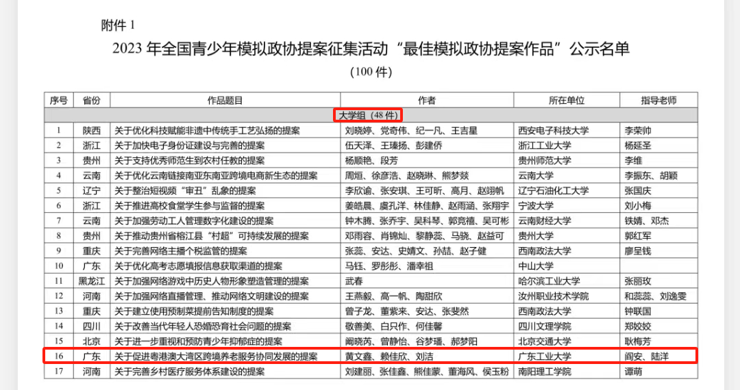 近日,共青团中央权益部公布了2023年全国青少年模拟政协提案征集活动评审结果,学校法学院学子黄文鑫、赖佳欣、刘洁的提案作品《关于促进粤港澳大湾区跨境养老服务协同发展的提案》(指导老师:阎安、陆洋)从全国57.8万余件提案作品中脱颖而出,荣获全国“最佳模拟政协提案作品”奖(大学组)。全国仅有48件提案作品获得此荣誉,其中4件来自广东省高校,分别为线上买球官网(中国)官方网站、中山大学、华南理工大学、南方科技大学。