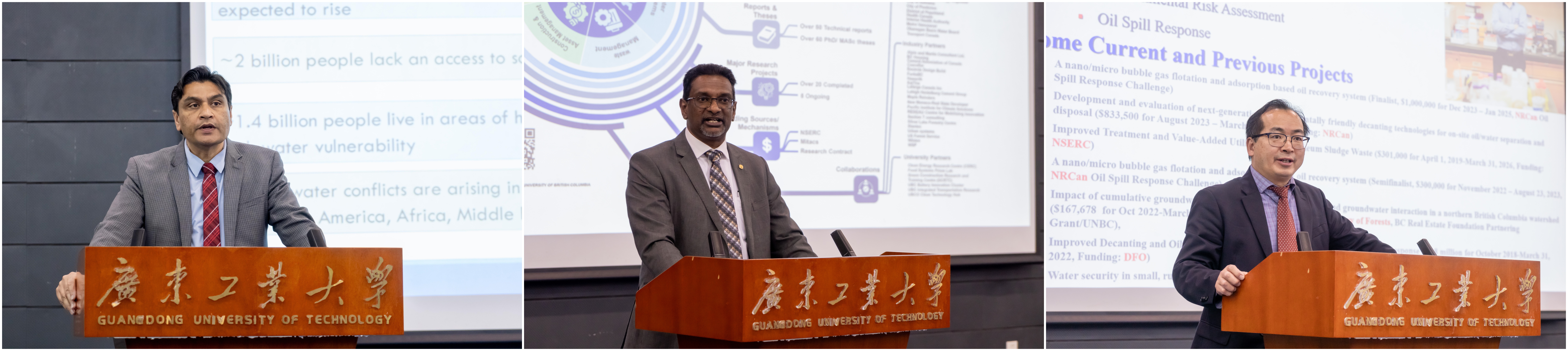 会后,Rehan Sadiq一行为学校师生作环境资源领域的学术报告,Rehan Sadiq教授作题为“A Vision for One-Water Community”的报告,倡导整合自然和社会水循环,开展水资源综合管理和可持续利用,建立以整合水为核心的社区发展模式;UBC大学奥肯纳根分校土木工程系主任Kasun Hewage教授,分享了以“Transforming Existing Communities into Net-Zero Energy Status: A Canadian Research Perspective”为题的研究报告,探讨现有社区转变为净零能耗社区的技术路线,从技术创新、政策支持和社区参与等方面提出经验和启示;UNBC大学工学院杰出教授Jianbing Li博士分享了题为“Value-added Utilization of Petroleum Sludge Waste”的研究,对石油废物环境问题和资源价值进行了深入剖析,提出了增值利用方法,促进资源高效利用和环境可持续发展。