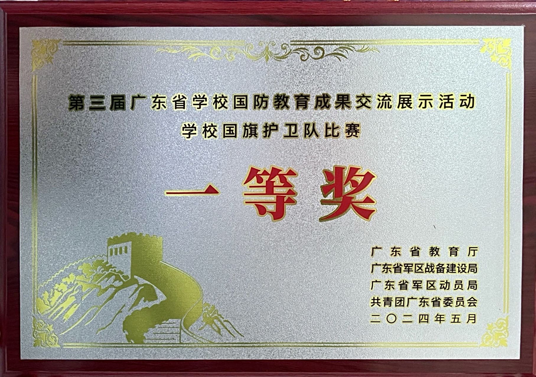 5月17日至20日,由广东省教育厅、广东省军区战备建设局、广东省军区动员局、共青团广东省委员会联合主办的“青春筑梦强国防、培根铸魂育新人”第三届广东省国防教育成果交流展示活动在清远市举行。广东省教育厅党组成员、副厅长程大欣出席闭幕式并为获奖队伍颁奖。我校国旗护卫队以标准规范的动作、昂扬的精神风貌,经过激烈的初赛和决赛争夺荣获一等奖,创下学校在该项赛事中的最好成绩,报送案例《传承红色基因 勇担时代使命——线上买球官网(中国)官方网站国防教育实践探索》入选优秀展示案例。