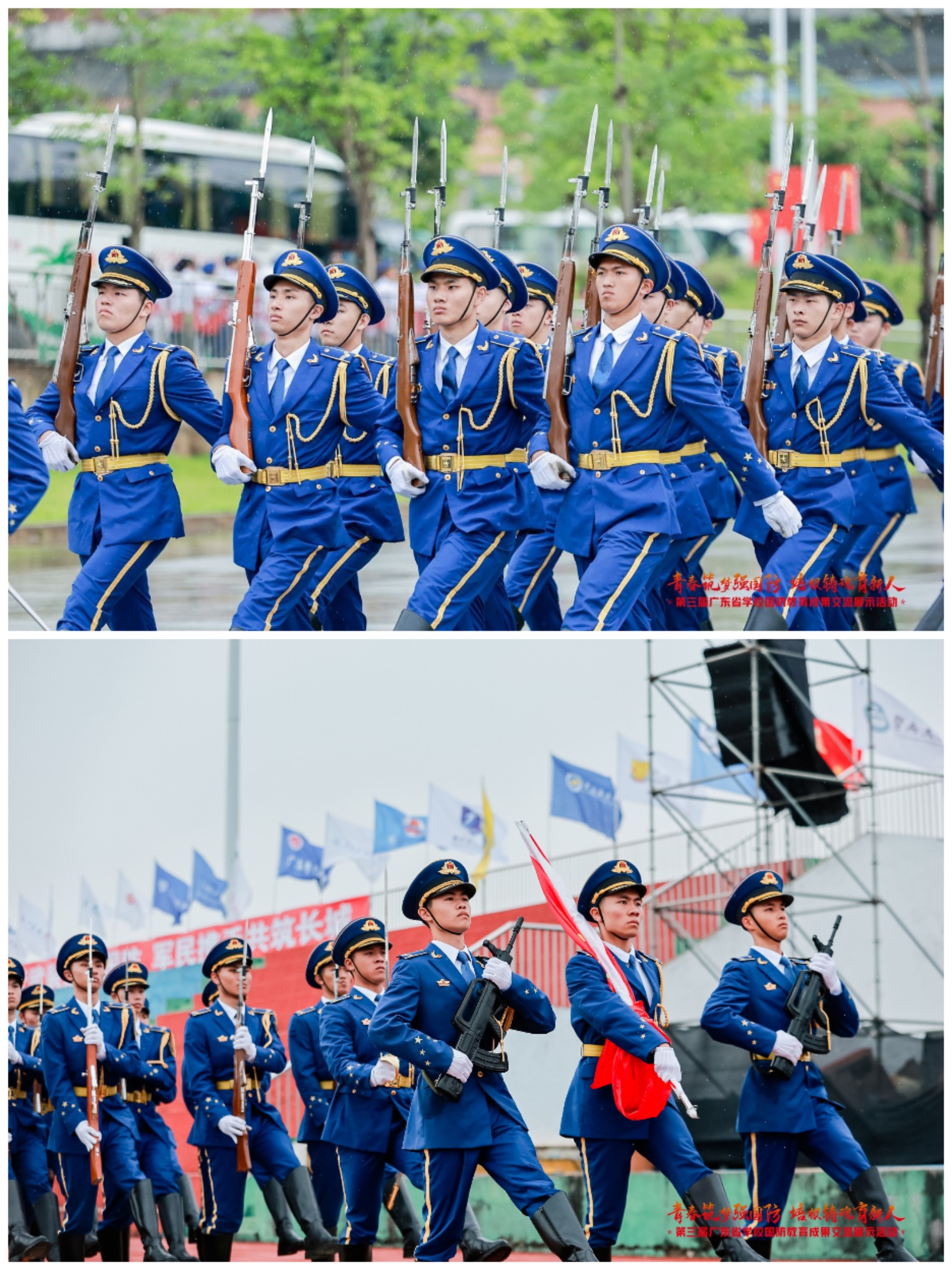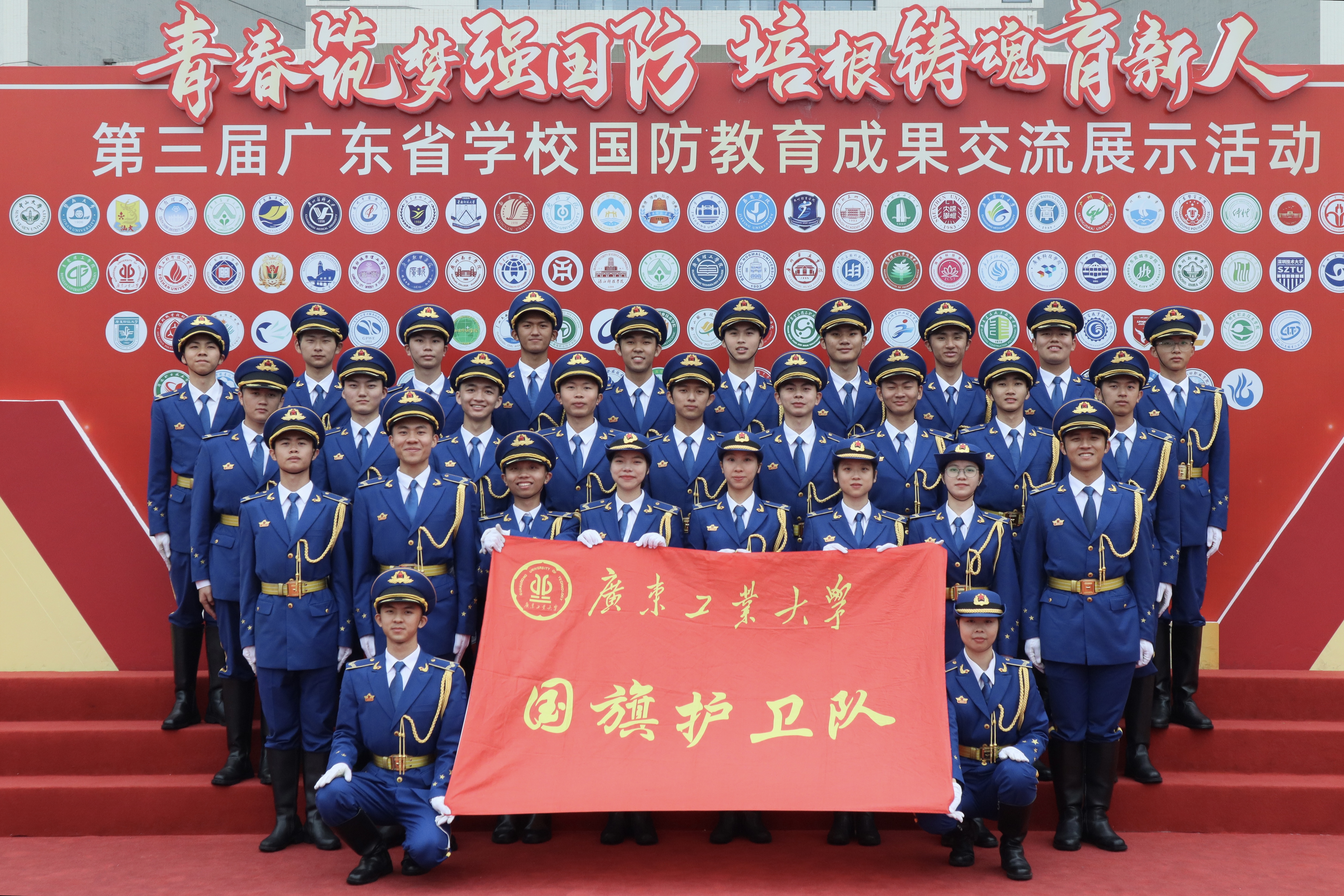 广东省国防教育成果交流展示活动包括学校国旗护卫队比赛、国防教育成果展示和国防教育论坛,目的是引导青年师生树立报国理想、培养家国情怀,将个人理想与祖国命运、民族命运紧密相连。比赛场上,学校国旗护卫队信心坚定、英姿飒爽,以整齐划一的动作、铿锵有力的步伐走向升旗台,每一步正步、齐步都一气呵成,坚定有力,五星红旗随着《义勇军进行曲》缓缓上升,充分展现广工国旗护卫队较高的训练水平和良好的精神面貌。