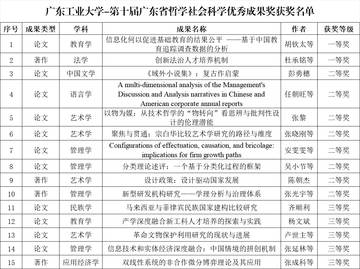 近日,广东省人民政府发布了《关于颁发第十届广东省哲学社会科学优秀成果奖的通报》。广工共有15项成果获奖,获奖数量较上届增加10项,其中一等奖2项、二等奖8项、三等奖5项,包括论文11篇、著作4部,研究领域涵盖教育学、法学、中国文学、语言学、艺术学、管理学、民族学、应用经济学等学科,获奖数量、质量及学科覆盖面均取得新的突破。