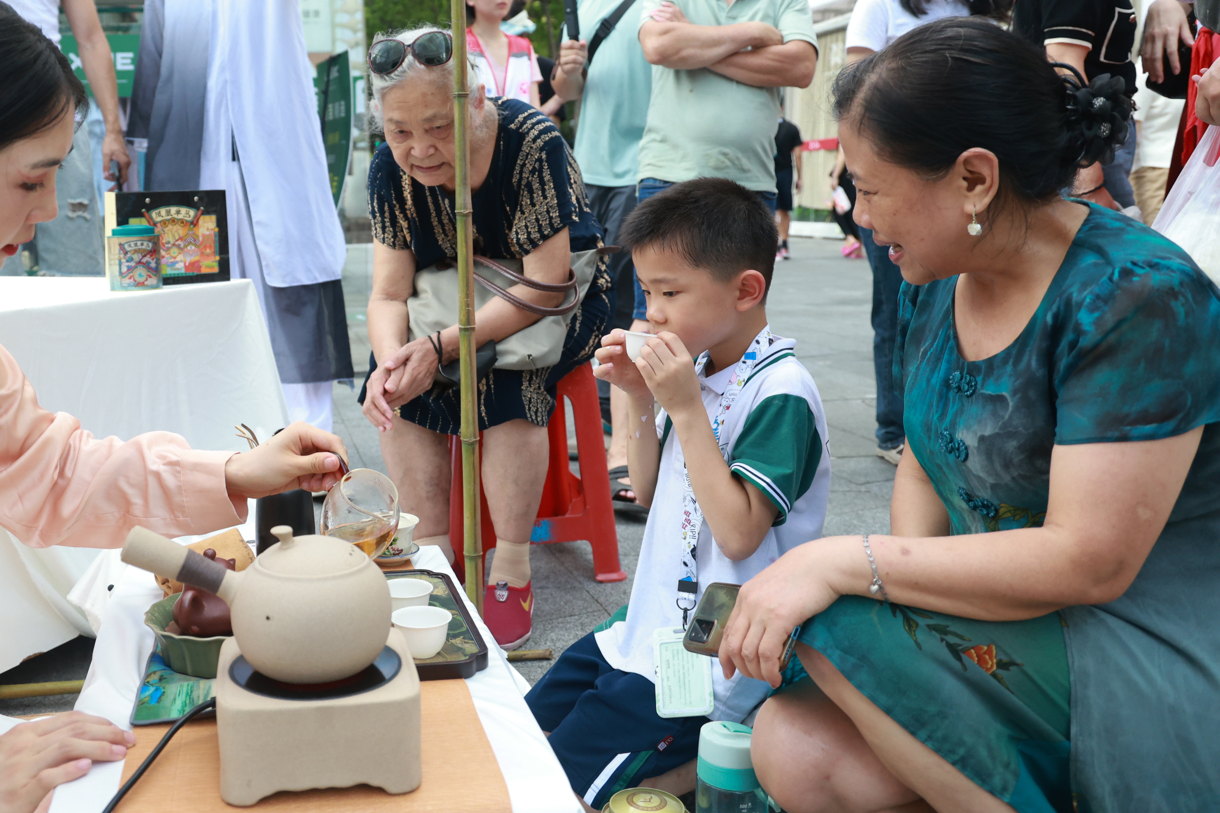 创作现场设有“艺见清香”茶旅艺彰“百千万工程”突击队潮州工夫茶体验、“艺见清心”非遗漆扇创作体验等多样互动区域。在潮州工夫茶展示中,街坊们学茶艺、品香茗,浸润单枞“清香”,深悟“清廉”主题。非遗漆扇的创作,将诚信、廉洁金句泼墨于扇面,在绚丽流动的色彩中或轻旋、或摇晃,一把承载非遗文化的漆染廉扇,为这个炎夏送来徐徐清风。