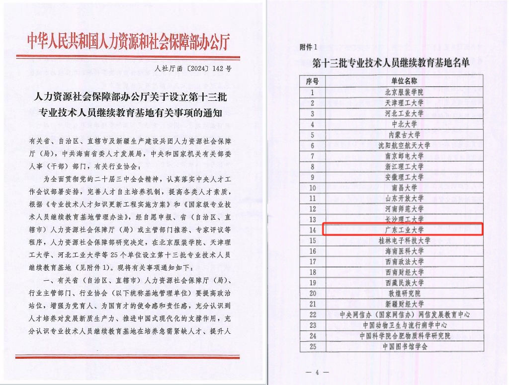 近日,国家人力资源和社会保障部办公厅发布《关于设立第十三批专业技术人员继续教育基地有关事项的通知》 (人社厅函[2024] 142号),线上买球官网(中国)官方网站获批国家级专业技术人员继续教育基地,是今年通过申报审批的25家单位之一。