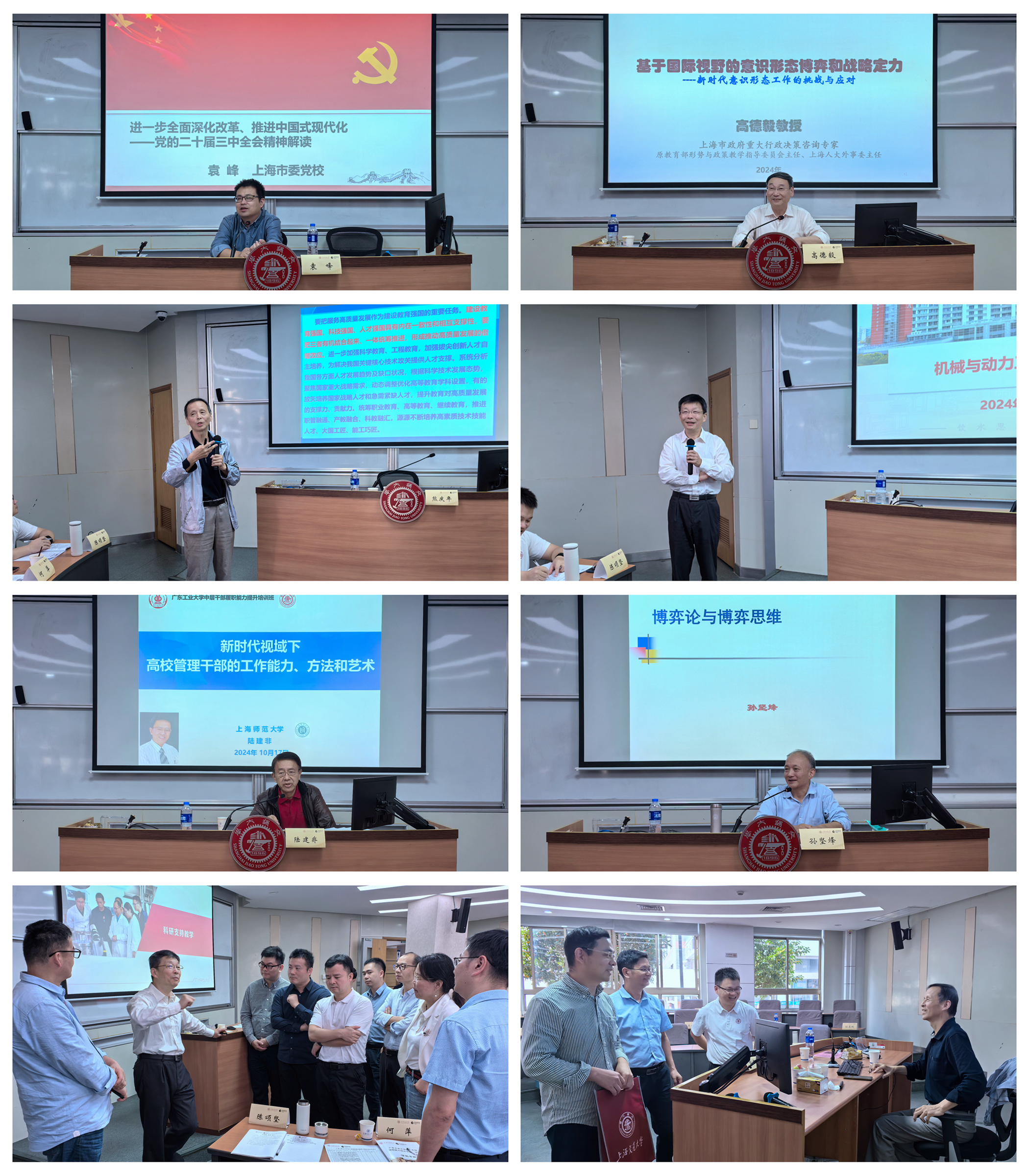 理论教学中,上海市委党校袁峰教授做《学习贯彻党的二十届三中全会精神》专题辅导报告,从报告起草的背景与考虑、框架与主要内容、新征程新目标三个方面对党的二十届三中全会精神进行了全面细致的导学辅学。上海市政府重大行政决策咨询专家,原教育部形势与政策教学指导委员会主任、上海人大外事委主任高德毅教授讲授《基于国际视野的意识形态博弈和战略定力》,与学员交流探讨了意识形态的概念、国际视野下的意识形态博弈,以及新形势下如何保持战略定力和政治责任。复旦大学高等教育研究所原所长熊庆年教授以《新时代中国高等教育的改革创新》为题,从系统性变革、人才培养模式迭代、知识生产方式转换、数字化赋能、人才成长生态、科学战略规划等多个方面详细阐述了高质量发展要求下,高等教育改革创新的探索与实践。上海交通大学机械与动力工程学院院长杜朝辉教授,聚焦《深化改革促发展,凝特聚优创一流》,通过上海交通大学机械与动力工程学院院系治理改革的实践案例,从本科生培养、教师队伍建设、科研支持教学、财务综合预算、三全育人实践、党建与内部管理六个方面,详细讲述了“校办院”到“院办校”的改革实践。上海师范大学原党委书记陆建非讲授《新时代视域下高校管理干部的工作能力、方法和艺术》,围绕领导力、核心管理能力、“五项修炼”等内容,讲述了怎样成长为高校的“好干部”。中共苏州市委党校原副校长、二级巡视员孙坚烽以《博弈论与博弈思维》为主题开展案例教学,通过对博弈论三大思维模型的分析,深入浅出讲解如何换位思考,谋求合作共赢。每次课程学习,学员们都精心“开课”,认真“结课”,积极向老师提问,与老师热烈交流。