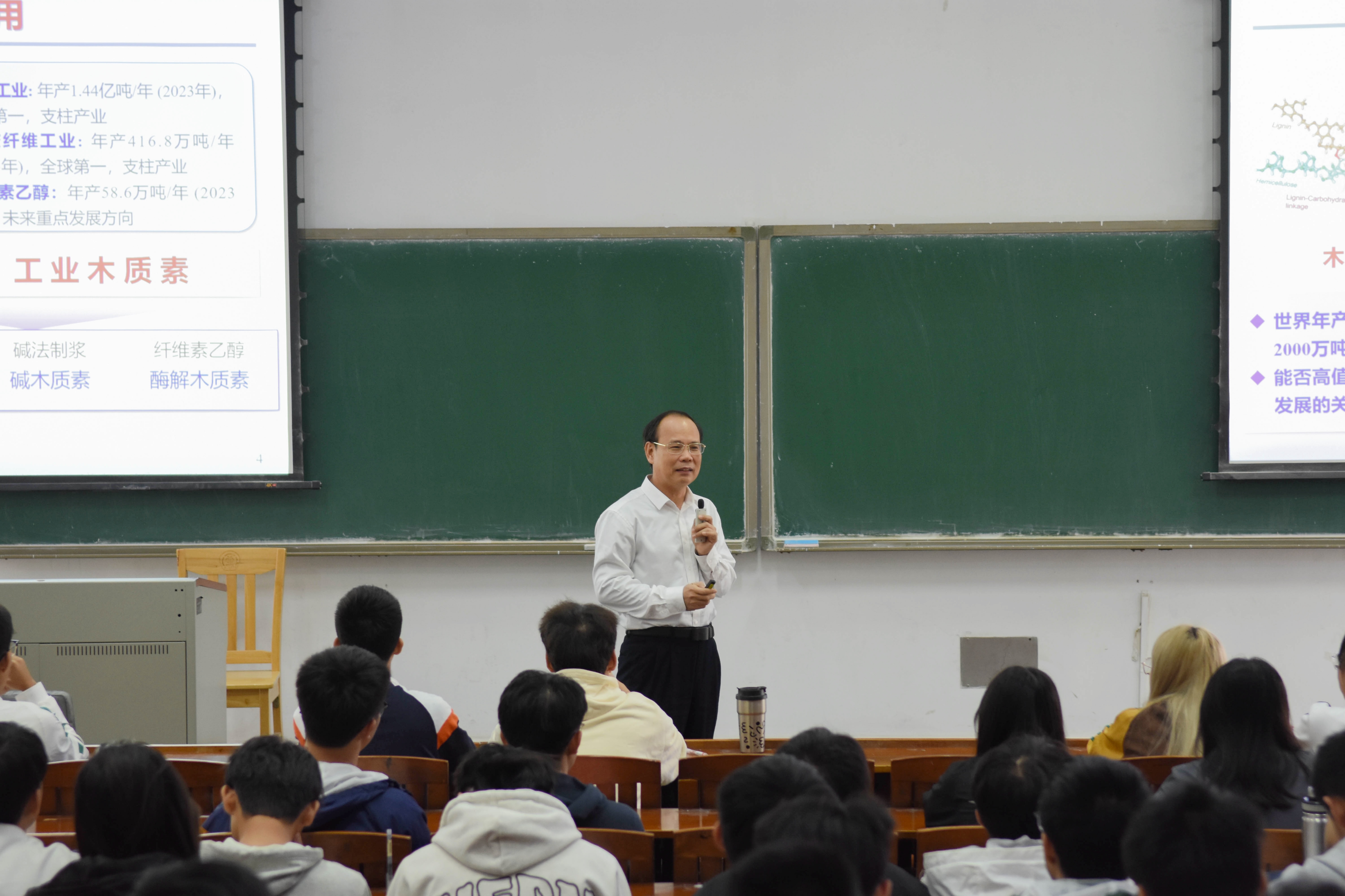 课程伊始,邱学青用幽默风趣的方式向同学们介绍了化学化工在生活中的广泛应用,指出化工产品大部分来源于不可再生的化石资源,如石油和煤炭。他巧妙地用石油和煤炭的黑色与工业木质素的黑色相比较,引发同学们对木质素的兴趣和好奇。接着,邱校长紧密结合国家政策和自身科研工作经历为同学们讲述了工业木质素近年来的研究成果,以工业木质素的来源及利用为切入点,引导同学们探索木质纤维素等可再生资源对于推动人类社会可持续发展的重要意义。