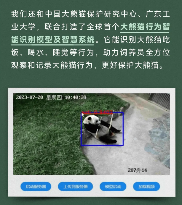 在案例报告中,特别展示了广工腾创班十余名00后大学生与腾讯公司、中国大熊猫保护研究中心紧密合作,共同研发的全球首个“大熊猫行为智能识别模型及智慧系统”,系统可智能识别圈养大熊猫进食、喝水和睡觉等日常行为,准确率超过了80%。算法模型可将大熊猫日常行为的记录过程智能化、数字化,填补该研究领域的空白,对大熊猫保护具有重大意义。