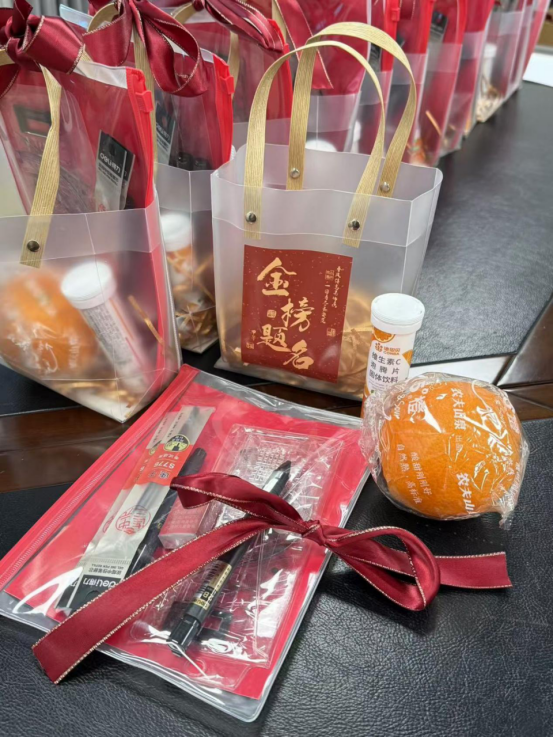 外国语学院在生活西区先锋驿站组织“‘研’途相伴,‘公’祝上岸”2025届毕业生考研考公慰问活动。毕业班辅导员将内含了寓意“诸事皆宜”“好事发生”的钥匙扣和挂件、暖宝宝、考试文具、“逢考必过”袜子等小礼物的考试加油礼包送给同学们,鼓励他们调整心态、平衡压力,帮助他们在考试的最后冲刺阶段保持积极心态,缓解备考过程中的焦虑与紧张情绪。