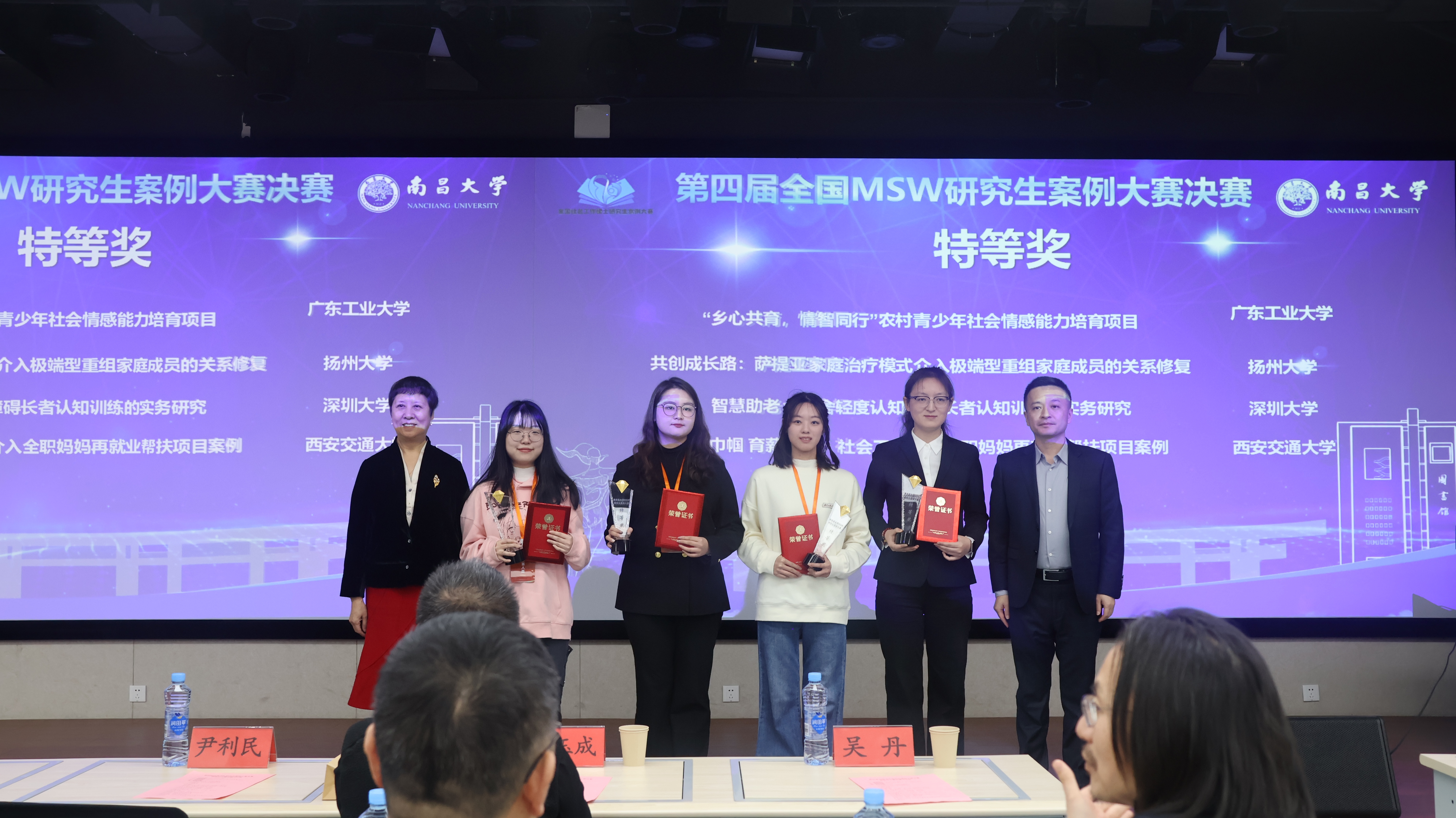 近日,第四届“全国MSW研究生案例大赛”决赛在南昌大学圆满落幕,学校法学院社会工作系梁露尹老师指导,范静婷、郭雪敏、黄桢、陈欣团队申报的《“乡心共育,情智同行”农村青少年社会情感能力培育项目》首次挺进全国40强并晋级决赛,最终凭借卓越表现斩获本届大赛特等奖,梁露尹老师荣膺优秀指导老师奖。由梁露尹老师指导,梁桃花、谢燕荣、谢佳耘、虢云、赖政梼团队申报的《“家校润心,成长同行”——农村中学校家社协同育人项目》和由车海波老师指导,赖俐丽、李景丽、车晶晶、黄颖、武玉婷团队申报的《“互联网+”社会工作助力D镇青少年性教育项目》均成功入围全国百强案例。