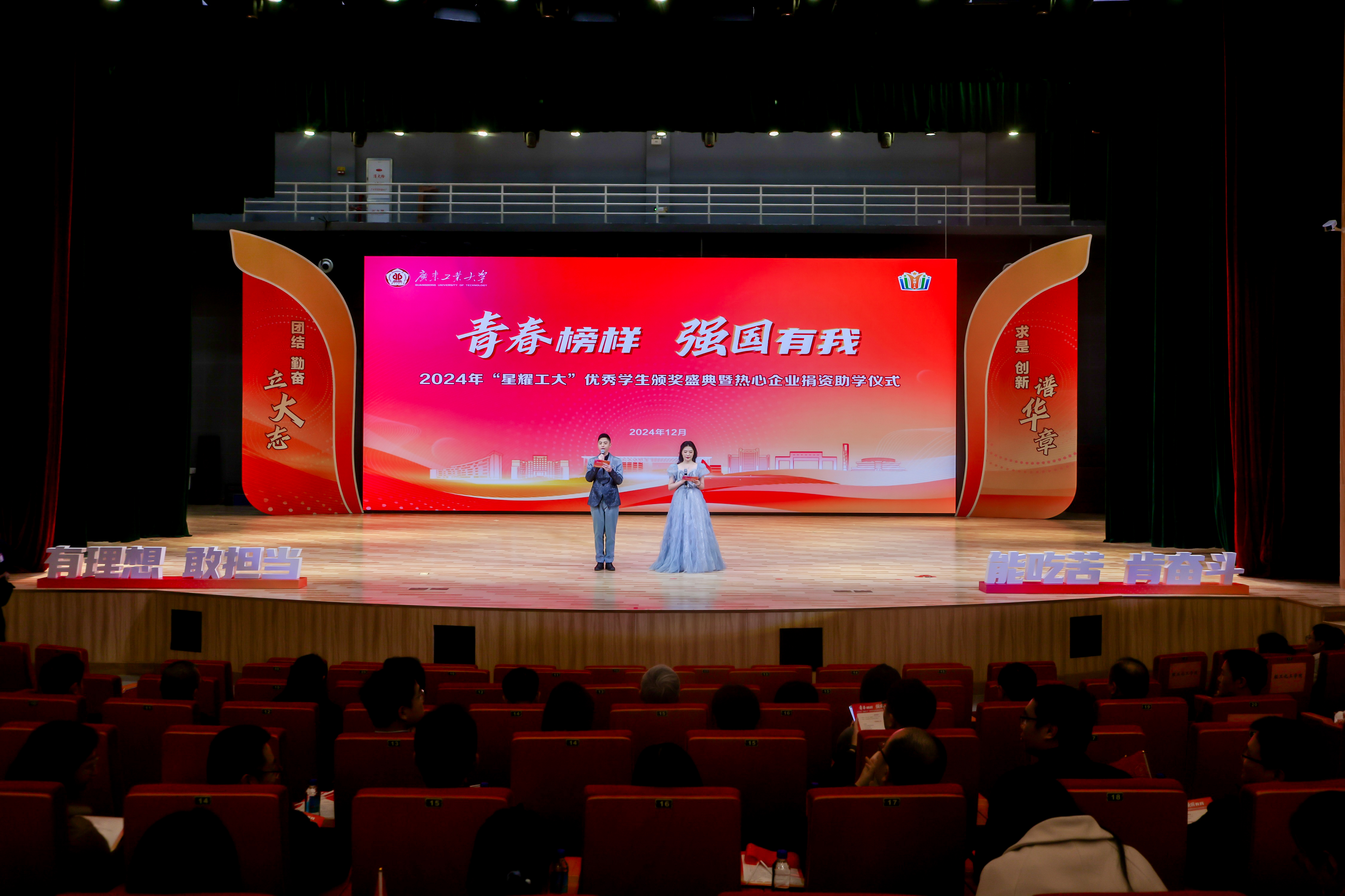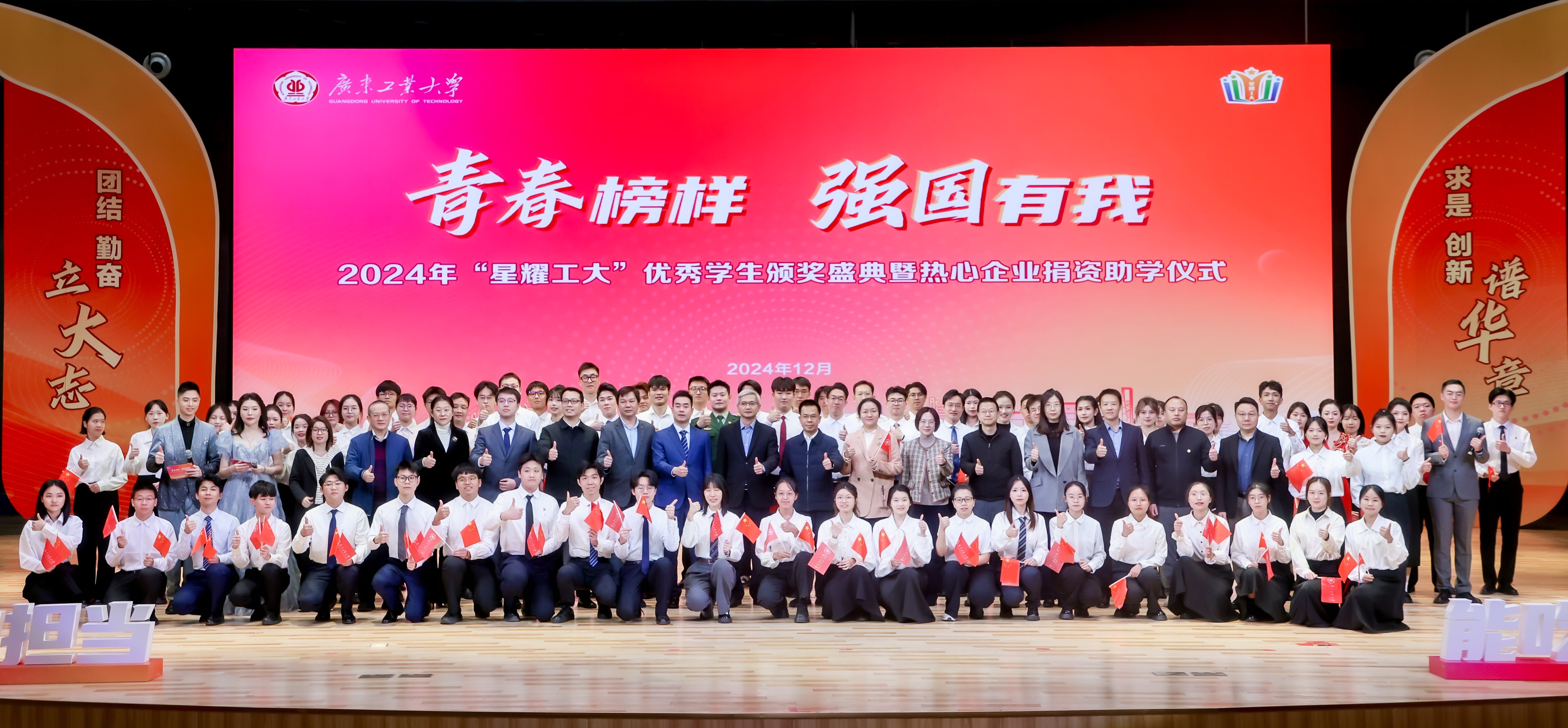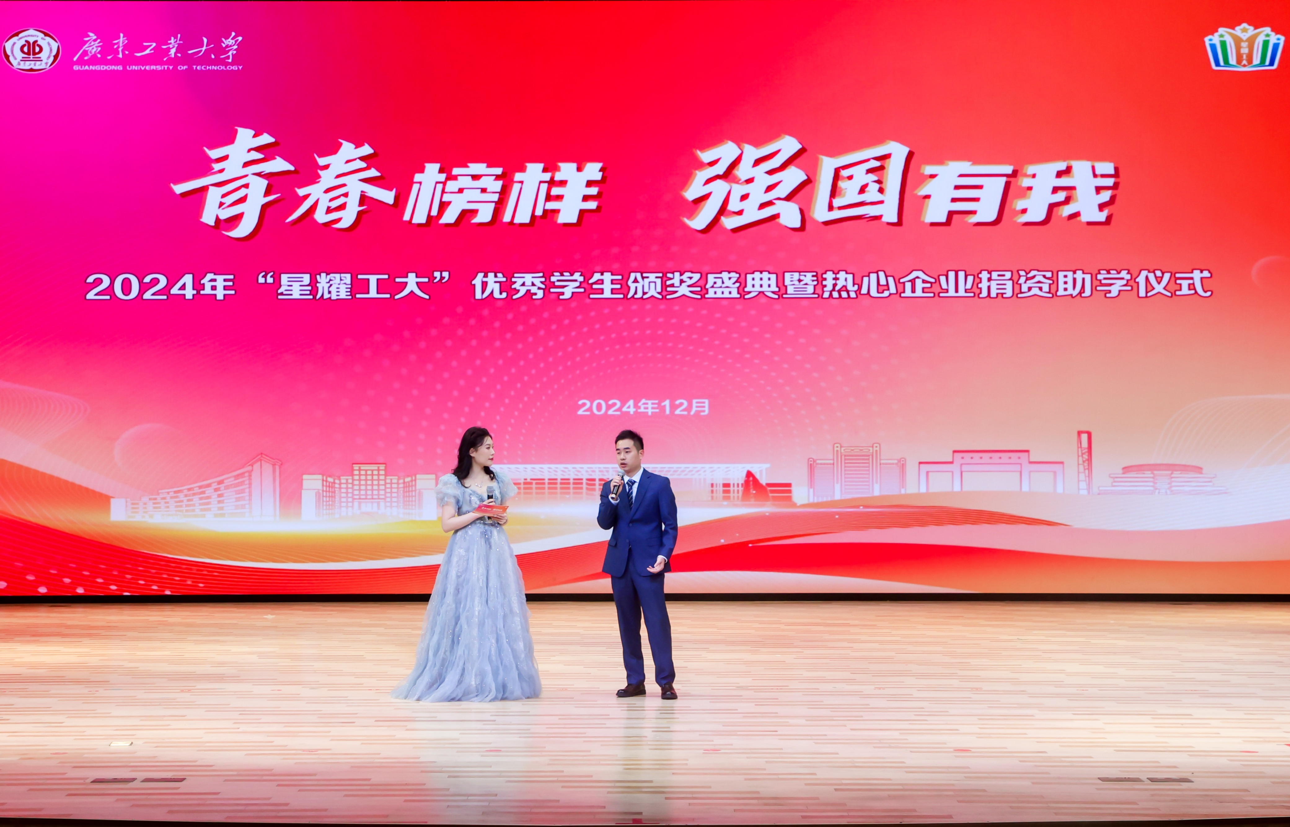 为充分发挥优秀大学生的示范带动作用,引导和激励广大学生向身边榜样学习,12月19日下午,学校在大学城校区文化活动中心演艺厅举行“青春榜样,强国有我”——2024年“星耀工大”优秀学生颁奖盛典暨热心企业捐资助学仪式。学校党委副书记陈卓武,广州睿达科教投资有限公司总经理黎耀煜、副总经理陈健浩,旭日集团大进投资高级经理周华胜,旭日集团总办地产组、助理总监、惠州公益组执委何青,旭日集团大进投资高级主任曾惠玲等领导嘉宾出席活动。学校党委办公室、校长办公室、党委组织部、党委宣传部、教务处、党委学生工作部、研究生院、心理健康教育中心、校团委、对外联络与校友事务办公室等部门单位相关负责人,各学院党委专职副书记、师生代表等共计400余人参加活动。