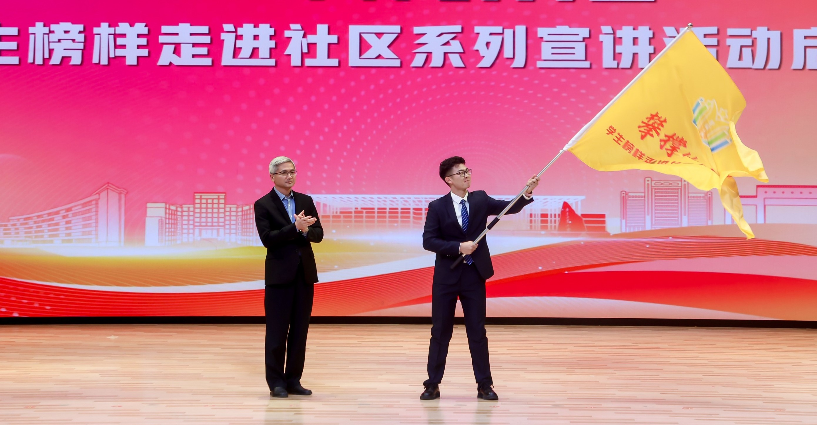 为进一步推进学生工作进社区,组织各领域优秀学子深入社区与同学们作面对面交流,提升优秀学子示范带动的覆盖面与实效性,活动上举行“攀撑的力量”——学生榜样走进社区系列宣讲活动启动仪式,陈卓武为宣讲团成员代表授旗。