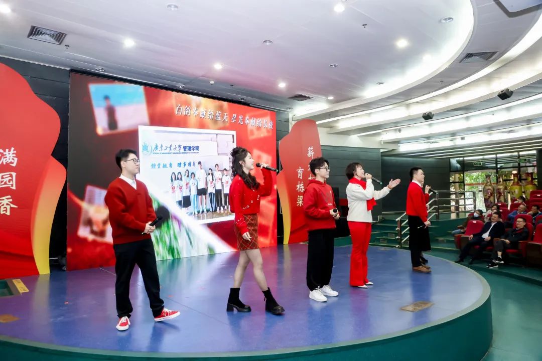 荣休教师的精神如同一把火炬,不仅照亮了教育的道路,更激励着青年教师不断前行。学校青年教师代表们以一曲充满深情与活力的歌曲串烧《岁月弦歌﹒致敬芳华》,用荣休老师的时代热歌,表达对前辈们无私奉献与卓越贡献的崇高敬意。《年轻的朋友来相会》重温青年教师入职广工的璀璨时光,《绒花》赞美荣休教师如绒花般温柔而坚韧,《渴望》唱出对知识的追求和对梦想的执着,《潇洒走一回》重燃一代广工人放手一搏的激情,《人世间》展示广工人携手拼搏、共铺学校辉煌之路,《爱拼才会赢》诠释广工人“不负韶华、奋斗有我”,《光阴故事》感恩在广工的每一份相遇,《奉献》感谢荣休教师照亮学生的前行之路,热烈而欢快的歌声将荣休仪式现场氛围推向了高潮。
