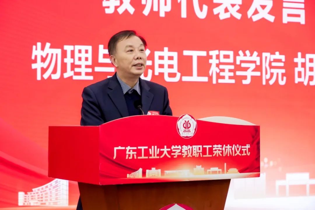 荣休教职工代表、物理与光电工程学院胡义华分享了在广工三十年辛勤耕耘的工作感悟,感谢学校提供展现个人能力的科研平台,坚信学校定能在迈向高水平创新型大学新征程中交上满意答卷。