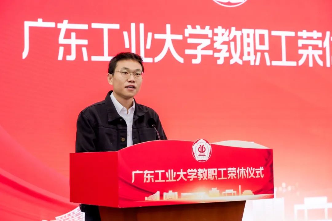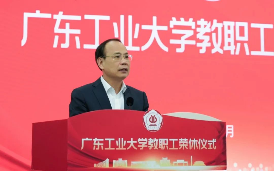 邱学青代表学校向荣休教职工致以崇高敬意与诚挚祝福,感谢他们作为学校改革发展的亲历者、见证者和贡献者,一生付出、一生奉献、一生坚守,深刻诠释了广工师者的文化精髓与价值坚守。他指出学校举办荣休仪式已经 4 期,展现了我校尊师重教的优良传统,以一种独属于广工人的仪式感,让师德力量薪火相传。他希望荣休老师离岗不离心,退休不退志,一如既往地支持学校的各项工作,谱写高质量发展的“广工篇章”。他强调青年教师要以老一辈教师为榜样,坚定理想信念,做胸怀“国之大者”的示范;坚持立德树人,做修德立身的典范;坚守教育初心,做教书育人的模范;潜心研究真学问,做学术创新的楷模,助力广工攀登新高峰。