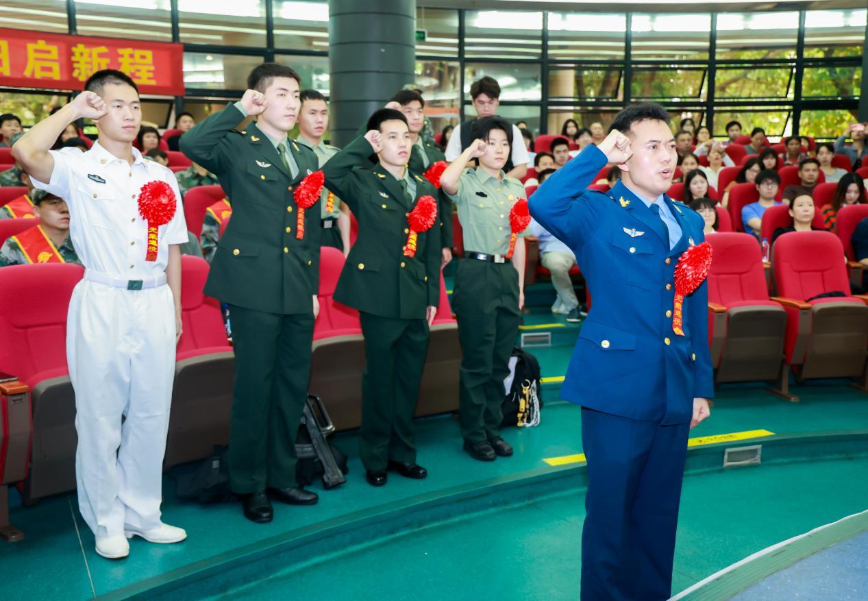 “背后是川西灿烂的漫天星辰,而此时演训任务中所有战机的氧气都是由我在生产和供应。看着演习的捷报,我感到一切都值了。”“军人的价值不在于获得多少,而在于能扛起多重。”机电工程学院硕士研究生陈彦机作为老兵代表生动的分享了他的入伍经历。“亲爱的母校,您当年为我们戴上的那朵大红花,如今已化作心底永不褪色的勋章。”艺术与设计学院本科生曾悦动情地说,她给大家讲述了自己作为女兵下定决心争当尖兵,努力专业过硬、军事过硬的军旅生涯,鼓励新兵在军旗飘扬处写下属于自己的热血篇章。