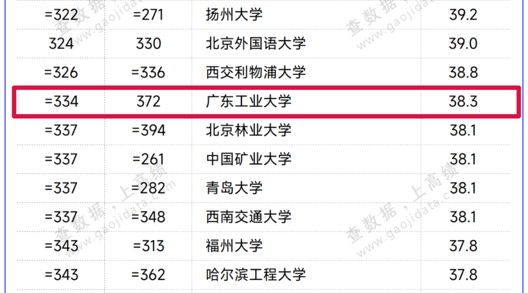 自2020年首次进入QS亚洲大学排名以来,广工从亚洲第601位、中国大陆第123位提升至亚洲第334位,中国大陆第63位;同年首次跻身QS世界大学学科排行榜,共有材料科学(全球401–550)、环境科学(全球451–500)、数学(全球451–500)和计算机科学(全球751–850)四个学科上榜。在广东省“冲补强”提升计划和“1+2+3”攀撑计划学科提升工程的推动下,学校的综合实力和学科水平得到跨越发展。