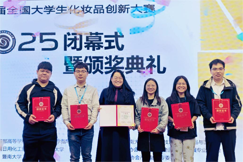 近日,在第三届全国大学生化妆品创新大赛决赛中,生物医药学院郑俊霞教授指导的学生团队(何鑫波、汤来裕、张庭欣、周明杰等),凭借作品《丝路红花:以花养颜赋活千年肌秘》荣获全国一等奖。本次大赛由教育部高等学校化工类教学指导委员会指导,中国日化协会、北京工商大学主办,暨南大学联合主办,是国内化妆品领域极具权威性的大学生创新赛事。