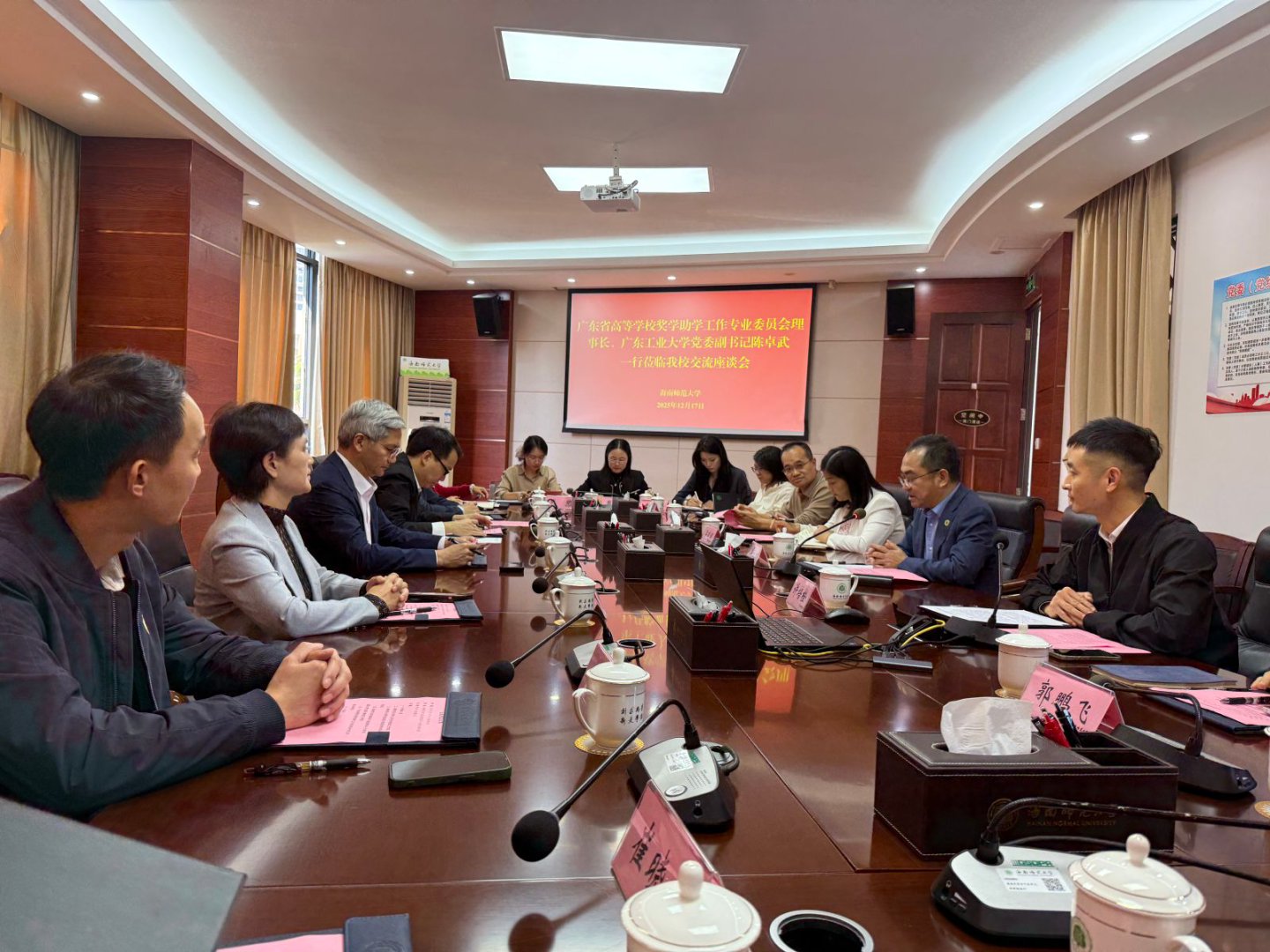 陈卓武对学校的热情接待表示感谢,并介绍了广东省高校奖学助学工作专委会基本情况,希望通过此次调研交流,学习借鉴海南高校在学生资助工作方面先进做法,切实推进广东省资助工作高质量发展。高校间围绕学生资助数字化建设、学生资助规范化管理、学生校园消费行为分析、隐形资助工作开展、家庭经济困难认定标准体系等主题展开深入探讨。会后,实地走访参观海南大学乘风书院、海南师范大学博物馆与学生一站式服务大厅。海南大学党委常务副书记张继友、海南师范大学党委副书记符刘才及学校相关领导老师参加调研活动。