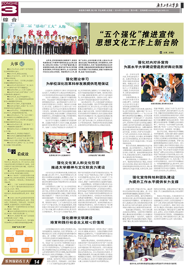 推动校报改版,大力推进校报工作上水平。吸取现代报纸的设计理念,对校报进行全面改版,更加注重对学校重要工作的纵深报道和对校园热点的关注,精心策划和组织系列重大报道、人物专访等,办报质量不断提高。创办《工大学子》,旨在“办学生自己的报纸”,更好地传递学生自己的声音。改版后的校报获得较好效果,在近年的全国、全省高校校报好新闻评选中,校报无论是在获奖数量还是获奖层次,均获得较大突破,2013年首获全国好新闻一等奖3项,获全省好新闻一等奖6项,在省内排名第三。组织举办 “大学生微报”办报大赛、摄影比赛、“我为广工大代言”等活动,引领校园文化生活。加强报网一体化建设。