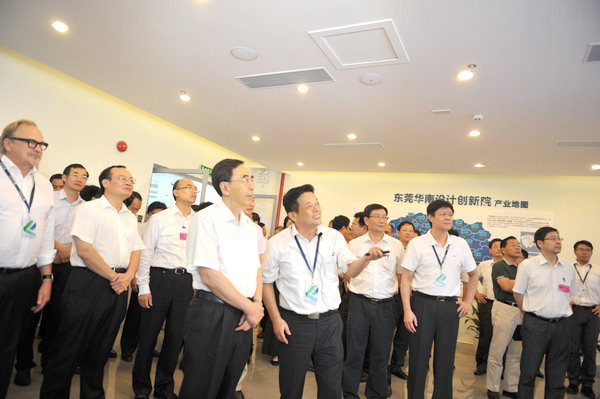 本网讯9月28日,广东省新型研发机构建设现场会在东莞召开。省长朱小丹率全省各地市主要领导视察我省新型研发机构代表、我校与东莞市共建的重大协同创新平台——东莞华南设计创新院。校党委书记苏一凡、校长陈新向朱小丹汇报了创新院建设情况。