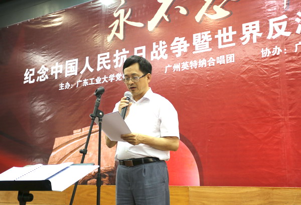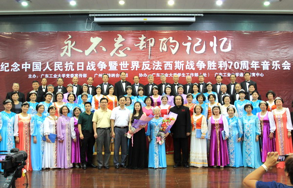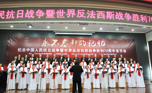 本网讯 “旗正飘飘马正萧萧,枪在肩刀在腰热血似狂潮;旗正飘飘马正萧萧,好男儿报国在今朝……”5月8日,永不忘却的记忆——纪念中国人民抗日战争暨世界反法西斯战争胜利70周年音乐会在我校大学城校园举行。音乐会由校党委宣传部、广东省老教育工作者协会广州英特纳合唱团主办,学生处、通识教育中心协办。校党委副书记汤耀平,党办、宣传部、团委、离退休处、国际教育学院等相关部门负责人和500名师生一起聆听了音乐会。