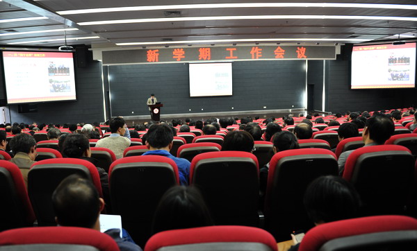 陈新部署了学校工作。他首先回顾了过去一年学校各项工作所取得的成绩,在教学、科研、平台、师资等方面“创造了多个首次”,“值得点赞”。面临新形势,如何抢抓新机遇,抢占制高点,实现新腾飞?他指出,要围绕高水平大学建设主线,转变思维方式,创新体制机制,以队伍建设为核心,以立德树人为根本,“强师资、促能力、育人才”,努力实现新突破。在师资队伍建设上,急需加速度提高师资队伍水平,凝聚全力推进师资队伍建设,为青年英才创造更大成长和发展空间,重视人才项目申报,优化评审机制。在学科建设上,学科方向要注重现实基础、市场需求、产业趋势和政策导向;学科队伍要强化团队,引育领军者、重视年轻梯队;学科平台要注重前瞻性,要规范高效采购设备;学科经费要突出扶强扶优,健全竞争性投入机制,重视社会评价和第三方评价。在科技工作上,要提升科研创新能力,加强制度建设,扎实推进协同创新中心建设,做好国家基金项目申报工作,加大力度培育重大成果,促进人文社科繁荣发展,加强科研团队精细化管理。在人才培养上,要深入推进育人模式改革,营造浓厚创新创业氛围,加大校企培养、平台培养的力度,做好专业评估,完成“学校审核式评估”自评工作,完善教学质量保障与监控体系,切实提高研究生教育质量水平。要加强国家合作和交流,积极推进“2+2”国际创新班项目、中德合作办学项目。要加强校园综合治理,共同打造有利于高水平大学建设的文化软实力。他最后说,惟改革者进,惟创新者强,惟改革创新者胜,全校师生要坚定信念、锐意改革,勇于创新、主动作为,破解发展中的困难和问题,推动学校迈上新的台阶。