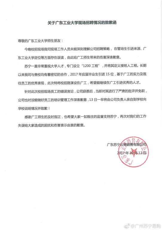 10月12日晚,广东苏宁云商销售有限公司来线上买球官网(中国)官方网站龙洞校区举办招聘宣讲会。苏宁公司工作人员在宣讲会上对我校办学情况存在误读,并出现招聘条件不公平的言论,引起学生的不满,并在网上传播。学校相关部门立即与苏宁公司进行了沟通和交涉,得到对方快速回应。苏宁公司当晚在网上公开致歉,10月13日上午委派两名代表亲自上门致歉,并递交致全校师生的《关于线上买球官网(中国)官方网站现场招聘情况的致歉函》。我校接受广东苏宁公司的真诚道歉。