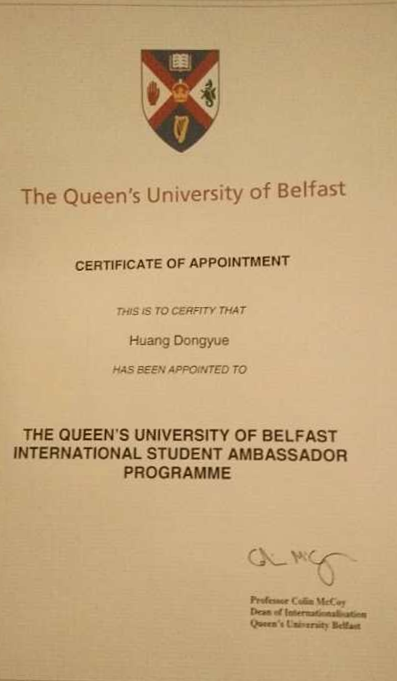 本网讯 我校国际教育学院2015级国际班优秀本科生、机械设计制造及其自动化专业黄东岳在圆满完成两年的中外合作办学基础教育阶段学习任务后,于2017年9月赴英国贝尔法斯特女王大学留学深造。期间,因学习成绩优异、具有良好的团队合作精神与沟通协调能力、在校园文化与志愿公益等各类学生活动中表现突出,于2017年12月被贝尔法斯特女王大学委任为“国际留学生大使”,成为英国贝尔法斯特女王大学与留学生沟通的桥梁,发挥联系线上买球官网(中国)官方网站与英国贝尔法斯特女王大学的纽带作用。