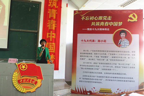 本网讯 11月5日上午,学校团委在大学城校园举行党的十九大精神传达宣讲会,邀请十九大代表、广东技术师范学院辅导员陈小花老师传达党的十九大精神。同时还开通了宣讲会线上直播间,并在广东青年之声平台以及学校团委官方微博进行了同步文字直播。