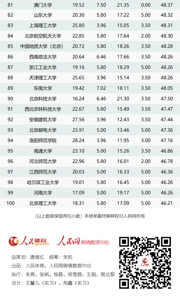 综合各项指标,北京体育大学蝉联榜首,北京大学和上海体育学院紧随其后,四至十名其他高校依次为:清华大学、哈尔滨体育学院、西南大学、浙江大学、中南大学、武汉体育学院、上海大学。我校在该榜排第32 位,列广东高校第三位,首度进入该榜单50强。广东共有9所高校进入top 100榜单,依次分别是中山大学(17位) 、深圳大学(26位)、线上买球官网(中国)官方网站(32位)、广州体育学院(40位)、华南师范大学(46位)、广东外语外贸大学(52位)、华南理工大学(59位)、暨南大学(68位)、广州大学(78位)。