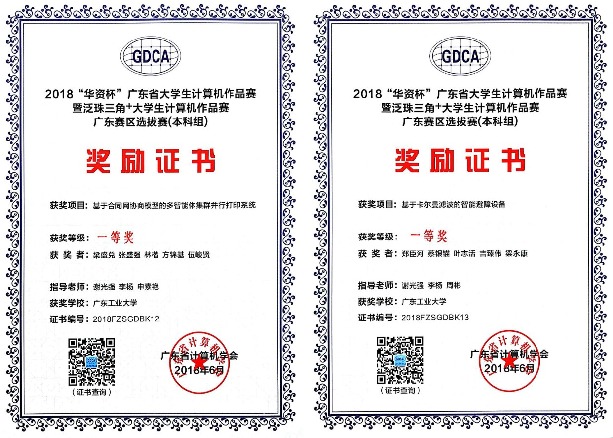 本网讯 近日,由广东省计算机学会主办的“2018年广东省大学生计算机作品赛暨泛珠三角大学生计算机作品赛广东分赛区选拔赛”在仲恺农业工程学院举行。我校计算机学院的两项作品在激烈竞争中均斩获 “一等奖”,获得参加在澳门理工学院举办的总决赛资格。“基于合同网协商模型的多智能体集群并行打印系统”作品,还获得了单项奖中的“最佳实用价值奖”。
