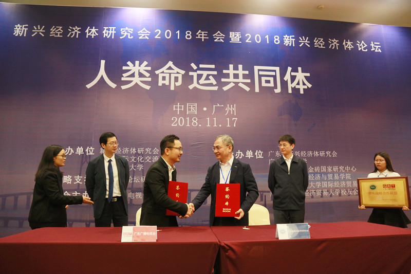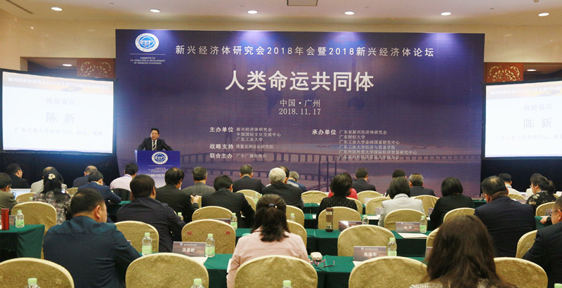 本网讯 由我校与中国新兴经济体研究会、中国国际文化交流中心主办,广东广播电视台联合主办,广东省新兴经济体研究会、我校经贸学院、金砖国家研究中心等单位承办的“新兴经济体研究会2018年会暨2018新兴经济体论坛”17日在广州白云国际会议中心举行,主题为“人类命运共同体”。我校党委书记、校长陈新教授,新兴经济体研究会会长、中国社会科学院学部委员、世界经济与政治研究所所长张宇燕研究员向会议致辞。我校副校长陈为民主持开幕式。