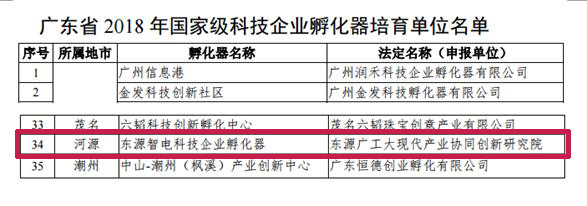 本网讯 近日,广东省科学技术厅公布了2018年国家级科技企业孵化器培育单位名单,东源广工大现代产业协同创新研究院申报的“东源智电科技企业孵化器”获得认定,是东源县首家国家级科技企业孵化器培育单位。