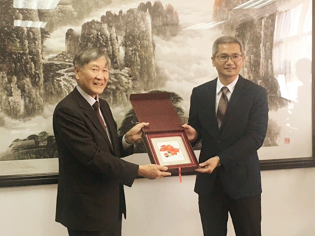 本网讯 11月9日上午,爱知东邦大学校长兼董事长榊直樹和东息教育集团日本研究院终身院长秦明吾男等一行访问我校,副校长陈卓武在大学城校园会见了来宾。
