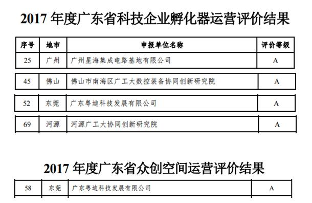本网讯 10月23日,广东省科学技术厅公布2017年度广东省科技企业孵化器、众创空间运营评价结果,评为优秀(A级)的孵化器70家,评为优秀(A级)的众创空间75家。