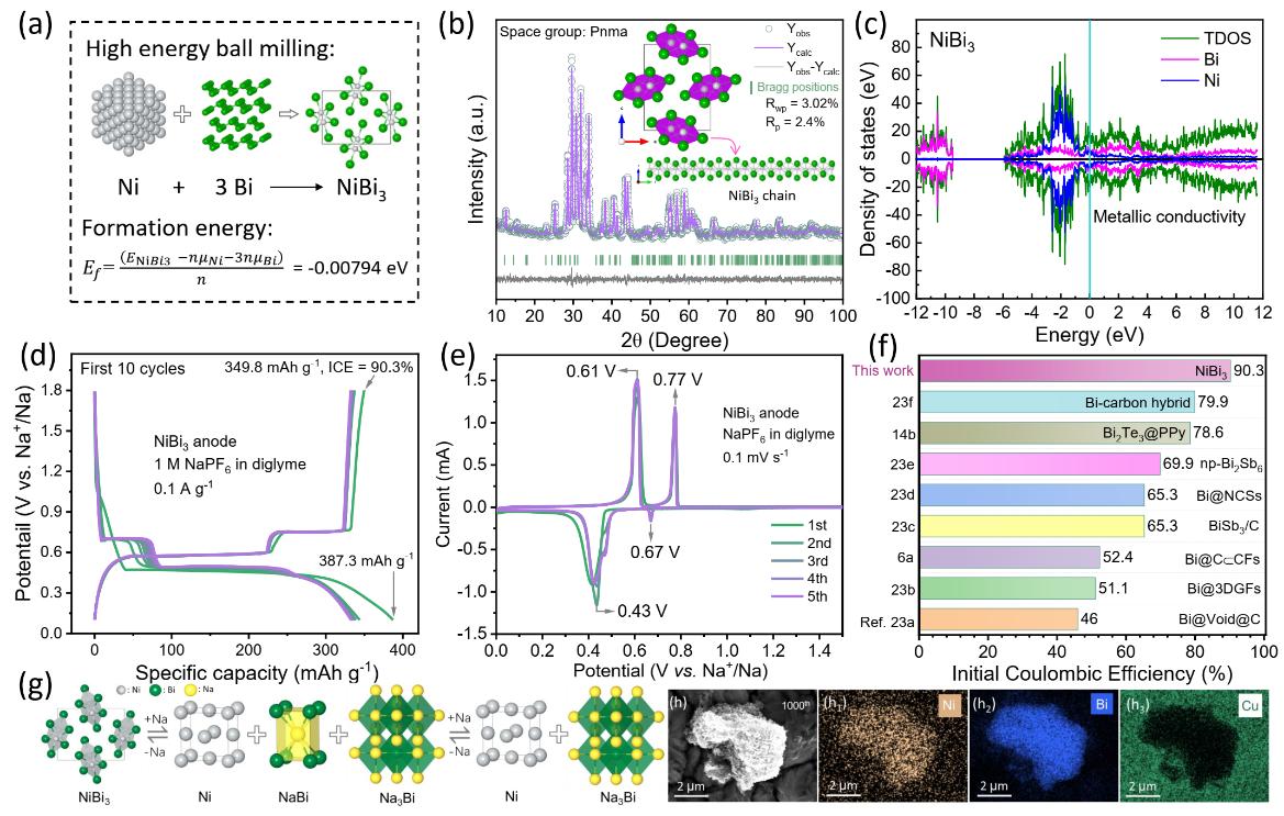 具有层状结构的铋(Bi)由于其较大的体积比容量和合适的氧化还原电位而成为钠离子和钾离子电池极具前景的负极材料。然而Bi负极的循环稳定性和倍率性能受到其大体积膨胀和缓慢的Na/K存储动力学的限制。而传统的改性方法如构建Bi纳米结构、与C复合、及与S,Se等元素结合等无法同时保证高首效、高体积比容量、低电位、长循环和高倍率性能。因此,本研究提出并开发了一种结构降维策略,通过将二维层状结构的Bi转化为具有增强的反应动力学和可逆性的准一维结构NiBi3,以实现Na/K离子快速存储和稳定循环。结果表明,具有低形成能、金属导电性和三维Na/K 离子扩散路径的准一维金属间化合物NiBi3在经过15000次储钠循环后具有高达94.1%的容量保持率 (332 mAh g-1),且其储钾性能表现出高达93.4%首次库伦效率。此外,对高度可逆的Na/K储存反应机理和循环驱动的形貌重构的研究进一步揭示了其高可逆性和体积膨胀自适应的起源。这项工作的发现为通过结构维度调控和循环驱动的形貌重构来设计高性能负极提供了一种新策略。