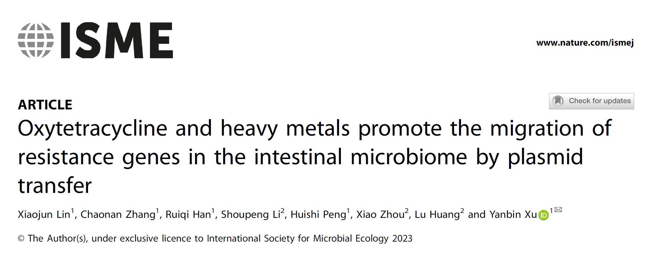 我校环境科学与工程学院许燕滨教授团队的最新研究成果“Oxytetracycline and heavy metals promote the migration of resistance genes in the intestinal microbiome by plasmid transfer”在Nature子刊、环境领域TOP期刊《The Isme Journal》上发表。该期刊近五年影响因子为12.300,CiteScore为20.40。线上买球官网(中国)官方网站为第一完成单位,许燕滨教授为通讯作者,博士研究生林晓君为第一作者,论文DOI: 10.1038/s41396-023-01514-w,学校分析测试中心提供测试服务。