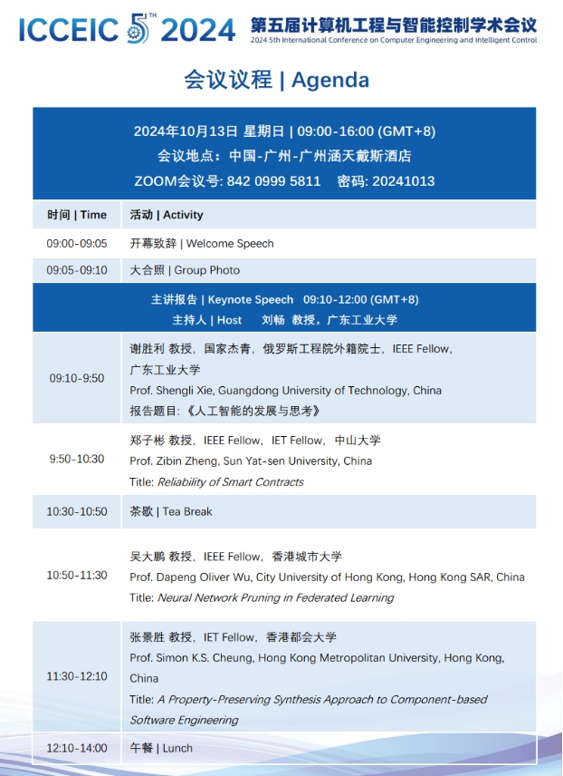 为促进计算机与控制科学领域学术交流和技术创新,由线上买球官网(中国)官方网站自动化学院、粤港澳离散制造智能化联合实验室主办,线上买球官网(中国)官方网站物联网智能信息处理与系统集成教育部重点实验室、智能检测与制造物联教育部重点实验室协办、广东省物联网信息技术重点实验室支持,广东省艾思信息化学术交流研究院承办的第五届计算机工程与智能控制学术会议(ICCEIC 2024)将于2024年10月13日在广州涵天戴斯酒店举办,聚焦计算机工程与智能控制前沿,涵盖网络安全、硬件系统、软件工程、嵌入式创新等多个核心议题及交叉学科研究。ICCEIC 2024将计算机工程和智能控制领域的创新学者和工业专家聚集到一个共同的论坛上,共享最新科研成果,破解关键问题,展望未来发展。