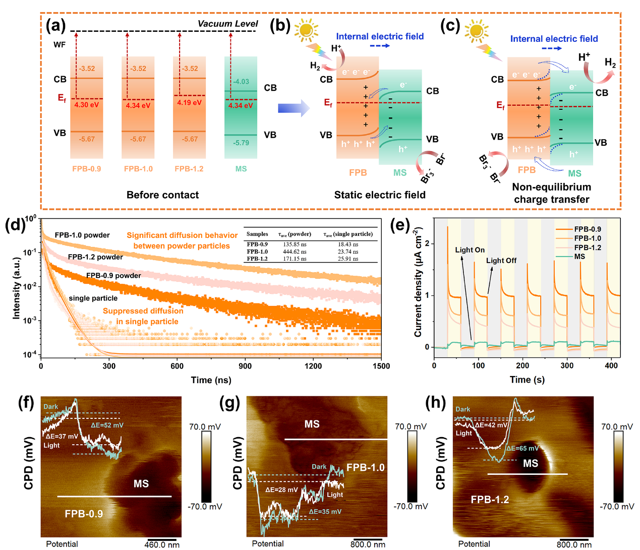 通过调控FAPbBr3钙钛矿前驱体化学计量比,构建FAPbBr3/MoS2原子级紧密键合界面。高密度Pb-S键合使电荷分离效率从29%跃升至63%,太阳能到氢能转换效率(STH)达8.6%。研究发现,钙钛矿自身高载流子密度梯度驱动的非平衡内建电场主导电荷转移,而非传统异质结机制。DFT理论模拟显示饱和配位界面优化了电子传输路径,富铅表面为原子级接触提供更多活性位点。优化后的异质结光催化产氢效率达原始FAPbBr3的98倍,瞬态吸收光谱证实电荷分离时间从489 ps缩短至112 ps,分离效率提升2.2倍。