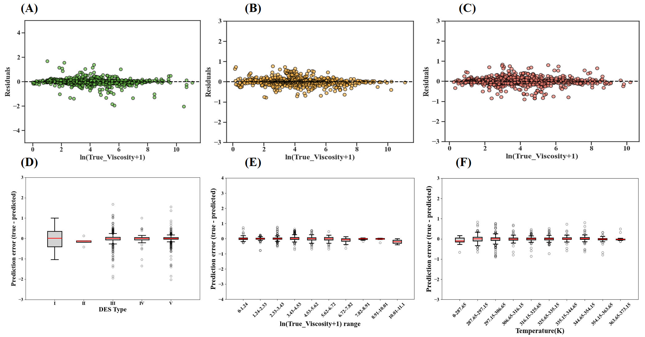 DESs作为“下一代绿色溶剂”,因合成简便、低毒可再生等优势,在分离、催化、电化学等领域应用广泛。然而,其黏度特性作为制约工业应用的核心参数,受分子组成、温度等因素影响显著,传统实验测量与预测方法存在效率低、泛化性差等局限。针对DESs黏度预测的技术瓶颈,团队创新性构建了一种融合消息传递神经网络(MPNN)、图注意力机制(GAT)和多层感知机(MLP)的多尺度黏度预测框架。该模型以SMILES分子结构及温度等理化性质为输入,通过MPNN提取分子局部化学键相互作用特征,借助GAT聚焦氢键供体/受体等关键亚结构生成全局分子表示,再结合预测密度等宏观理化性质,经MLP非线性变换实现黏度值精准输出。在5790个DESs样本数据集上的验证显示,模型预测精度高达R²=0.9945、平均绝对相对偏差(AARD)仅2.69%,显著优于随机森林(RF)、支持向量回归(SVR)等传统机器学习模型,且对极端黏度值(如高黏度样本)表现出强适应性,有效解决了新型DESs黏度预测泛化能力不足的问题。