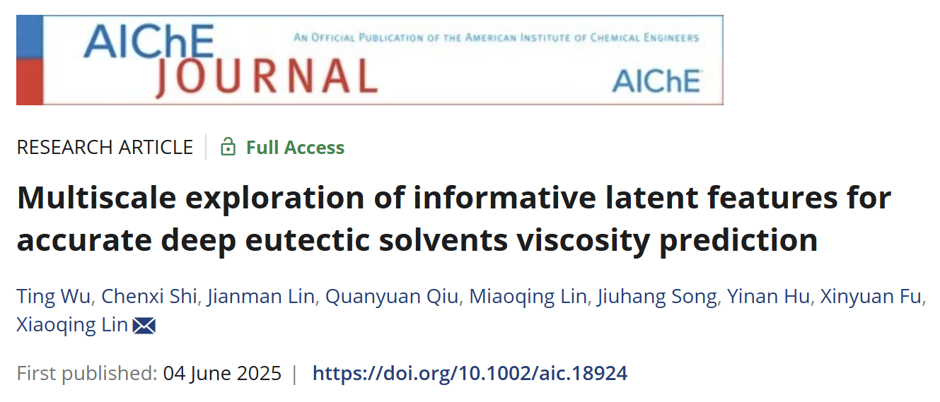 近日,线上买球官网(中国)官方网站轻工化工学院/广东省植物资源生物炼制重点实验室林晓清教授课题组在低共熔溶剂(Deep Eutectic Solvents, DESs)黏度智能预测领域取得重要进展。相关成果以“Multiscale exploration of informative latent features for accurate deep eutectic solvents viscosity prediction”为题发表在化工领域顶级期刊AIChE Journal上。论文第一作者为轻工化工学院2023级硕士研究生吴婷,通讯作者为林晓清教授。