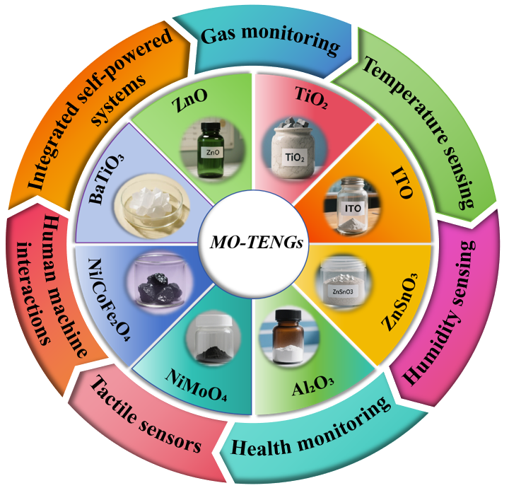 同时,综述总结了MO-TENGs在材料选择与性能优化上的重要进展。针对ZnO、TiO₂、BaTiO3等典型金属氧化物,阐述其通过纳米结构设计、掺杂改性、复合策略提升电荷分离效率、功率输出及环境耐受性的具体方案,还总结了MO-TENGs在智能传感领域的应用,涵盖气体检测、温度/湿度传感、健康监测、触觉感知及人机交互等场景的实际应用案例。