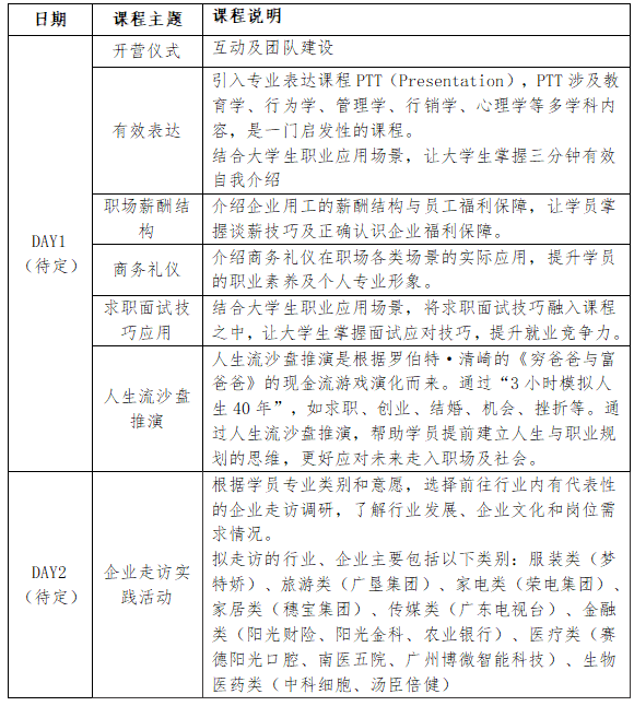 为加强学生就业创业实践能力的培养,提升就业创业及求职技能,引导学生走出校园了解当前行业现状与企业实际情况,为未来进入职场做好心理及能力准备,现面向广州校区高年级学生开展就业创业实践训练营暨第12届赢在广州之“阳光青创杯”大学生创业就业大赛选拔活动,具体事宜通知如下。