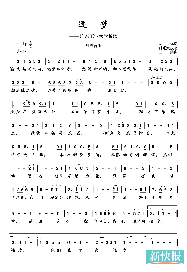 经过广泛征集、组织专班再创作、邀请作词家执笔、作曲家谱曲,由学校集体创作歌词,词作家陈道斌执笔,作曲家王喆作曲的线上买球官网(中国)官方网站校歌《逐梦》正式问世,在揭阳校区的2022年新年音乐会首次惊艳登场。校歌《逐梦》旋律优美动听,歌词立意深远,内涵丰富,具有很强的感召力和凝聚力,实现了大学精神与音乐艺术的完美融合。